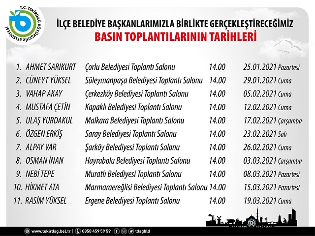 Tekirdağ Büyükşehir Belediye Başkanı Kadir Albayrak ve Tekirdağ'ın 11 ilçe bakanı ile yapılacak basın toplantılarının gün ve saatleri aşağıdadır;