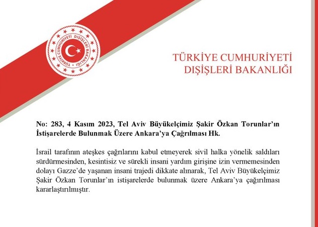 "İsrail tarafının ateşkes çağrılarını kabul etmeyerek sivil halka yönelik saldıları sürdürmesinden, kesintisiz ve sürekli insani yardım girişine izin vermemesinden dolayı Gazze’de yaşanan insani trajedi dikkate alınarak, Tel Aviv Büyükelçimiz Şakir Özkan Torunlar’ın istişarelerde bulunmak üzere Ankara’ya çağırılması kararlaştırılmıştır."