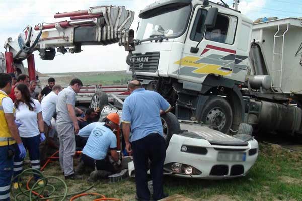 Kaza bugün Çorum-Anakara karayolu 7’nci kilometresinde meydana geldi. Samsun’dan Ankara istikametine giden Mehmet Meşe (44) yönetimindeki 42 AHE 52 TIR, iddiaya göre aynı istikamette giden ve kavşağa kontrolsüz giren Miraç Göker Çelenk (22) yönetimindeki 06 DR 9936 plakalı otomobile arkadan çarptı. Çarpmanın etkisiyle, TIR altına aldığı otomobili metrelerce sürükleyerek orta refüje çıktı. TIR’ın altında ters dönen otomobilin içerisindeki sürücü Miraç Göker Çelenk ile yanında bulunan Aylin Uysal (43) araç içerisinde sıkıştı. Kazadan TIR sürücüsü Mehmet Meşe de hafif yaralandı.