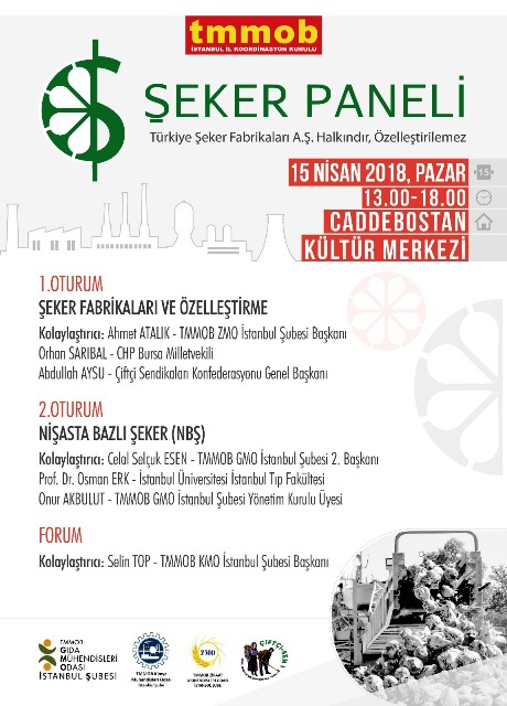 TMMOB İstanbul İl Koordinasyonu Sekreterliğinde; Gıda Mühendisleri Odası İstanbul Şubesi, Kimya Mühendisleri Odası İstanbul Şubesi, Ziraat Mühendisleri Odası İstanbul Şubesi ve Çifçi-SEN, şeker fabrikalarının satılmasına karşı 15 Nisan’da 'Şeker Çalıştayı' düzenleyecek....