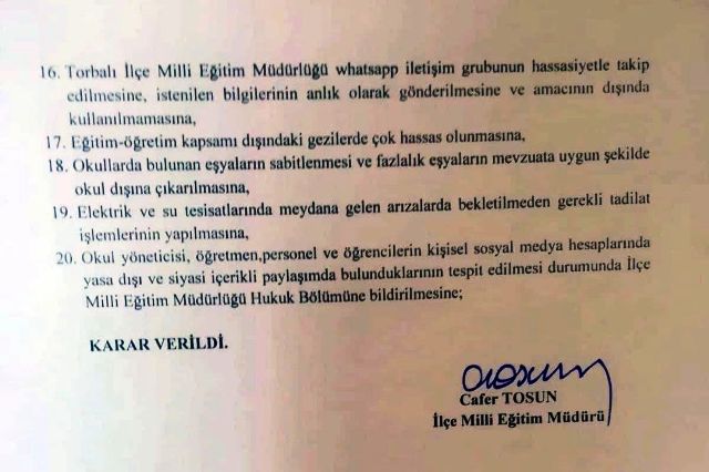 İzmir Torbalı İlçe Milli Eğitim Müdürlüğü, okullara gönderdiği yazıda, sosyal medyada siyasi paylaşım yapan öğretmen ve öğrencilerin bildirilmesini istedi.
