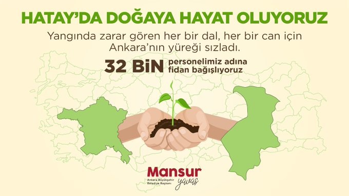 Ankara Büyükşehir Belediye Başkanı Mansur Yavaş'da kampanyaya katılanlar arasında. Mansur Yavaş; Hatay’daki yangın yüreklerimizi sızlattı. Doğanın yeniden yeşile kavuşması için 32 bin mesai arkadaşımız adına Hatay'a 32 bin fidan bağışında bulunuyoruz. 29 Ekim'de de Milli Mücadele'nin karargahı Ankara'mızda "Yeşilin Başkenti" projemizi başlatacağız. @DocDrLutfuSavas