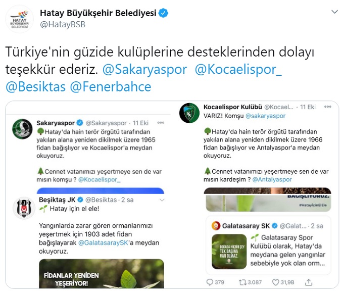 Hatay'da yaşanan yangın sonrası Belediye başkanları, spor kulüpleri, vatandaşlar, şirketler, STK'lar ve bireyler Hatay'a fide bağış kampanyası için seferber oldular.
