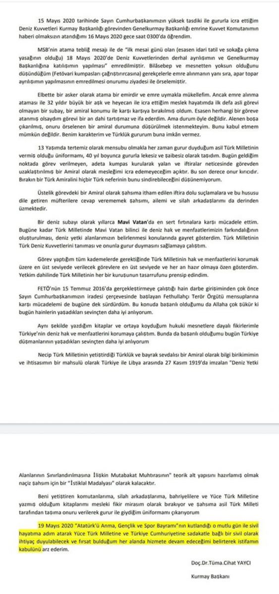 "15 Mayıs 2020 tarihinde Sayın Cumhurbaşkanımızın yüksek tasdiki ile gururla icra ettiğim Deniz Kuvvetleri Kurmay Başkanlığı görevinden Genelkurmay Başkanlığı emrine Kuvvet Komutanımın haberi olmaksızın atandığımı 16 Mayıs 2020 gece saat 03.00'da öğrendim.