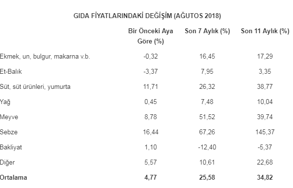 Araştırmaya göre 2018 yılının ilk sekiz aylık döneminde gıda harcamalarında yaşanan toplam artış ise yüzde 25,58 olarak gerçekleşti. Bu dönemde ekmek, un, bulgur, makarna harcamaları yüzde 16,45 oranında artış kaydetti. Et-balık fiyatları yüzde 7,95 oranında artarken, süt ve süt grubu ürünlerin fiyatlarında yüzde 26,32, yağ fiyatlarında yüzde 7,48, meyve fiyatlarında yüzde 51,5 artış gözlendi. Sebze fiyatlarında yüzde 67,26 artış kaydedilirken bakliyat fiyatlarında yüzde 12,4 oranında azalış yaşandı. Son sekiz ayda diğer gıda maddelerinin fiyatlarında ise ortalama yüzde 10,61 oranında artış oldu.