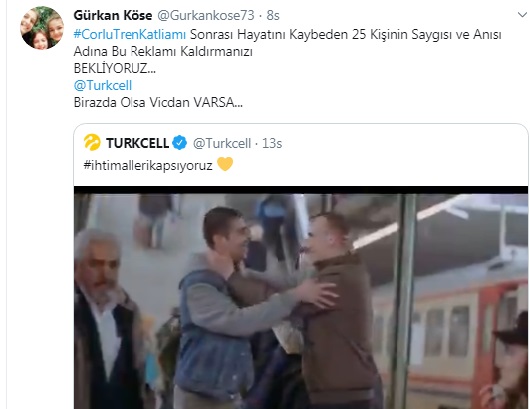 Turkcell'in “ihtimallerikapsıyoruz” başlıklı başlıklı bir video yayımladı. Tren istasyonunda geçen Turkcell'in reklam filmi Çorlu tren faciasını anımsattı. Turkcell'in reklam filmine tepki gösteren Çorlu tren faciasında kızını kaybeden Gürkan Köse reklam filminin kaldırılmasını istedi.