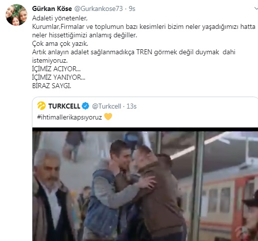 Gürkan Köse Turkcell'in “ihtimallerikapsıyoruz" başlığıyla paylaştığı reklam filmi için "Adaleti yönetenler, Kurumlar,Firmalar ve toplumun bazı kesimleri bizim neler yaşadığımızı hatta neler hissettiğimizi anlamış değiller. Çok ama çok yazık. Artık anlayın adalet sağlanmadıkça TREN görmek değil duymak dahi istemiyoruz. İÇİMİZ ACIYOR... İÇİMİZ YANIYOR... BİRAZ SAYGI" ifadelerini kullandı.