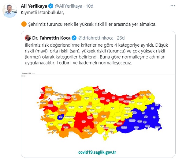 İstanbul Valisi Ali Yerlikaya açıklamasında; "Kıymetli İstanbullular, Şehrimiz turuncu renk ile yüksek riskli iller arasında yer almakta." dedi.