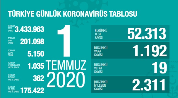 Sağlık Bakanı Dr. Fahrettin Koca 1 Temmuz 2020 Sağlık Bakanlığının Türkiye güncel verilerine paylaştı; Pandemi Koronavirüs Covid_19'dan bugün 19, toplamda 5.150 kişi hayatını kaybetti.