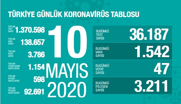 Sağlık Bakanı Dr. Fahrettin Koca 10 Mayıs 2020 Sağlık Bakanlığının Türkiye güncel verilerine paylaştı; Pandemi Koronavirüs Covid_19'dan bugün 47, toplamda 3.786 kişi hayatını kaybetti.