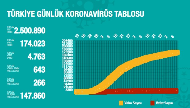 Sağlık Bakanı Dr. Fahrettin Koca sosyal medya hesabından yaptığı açıklmada; "Test sayısında 2,5 Milyona ulaştık. Şimdiye kadarki vakaların %85’i iyileşti. Yeni iyileşen vaka sayısıyla yeni tanı konan vaka sayısı birbirine yakın. Virüs gücünü hatalı iyimserlikten alıyor. “Virüsün etkisi azaldı” yanılgısı ile tedbirleri terk etmeyin" dedi.