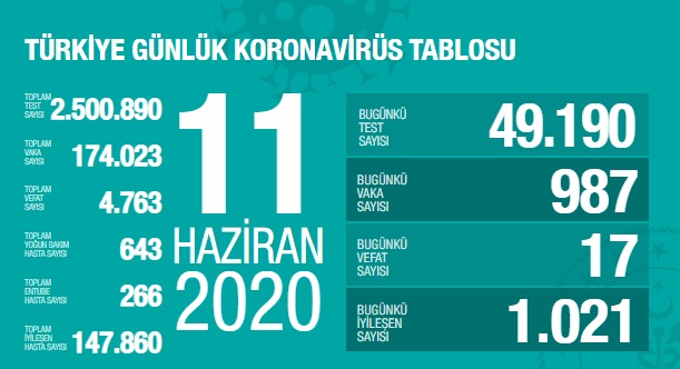 Sağlık Bakanı Dr. Fahrettin Koca 11 Haziran 2020 Sağlık Bakanlığının Türkiye güncel verilerine paylaştı; Pandemi Koronavirüs Covid_19'dan bugün 17, toplamda 4.763 kişi hayatını kaybetti.