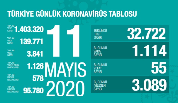 Sağlık Bakanlığı tarafından 11 Mayıs 2020 tarihli, Türkiye Günlük Koronavirüs Covid_19 Tablosu paylaşıldı.