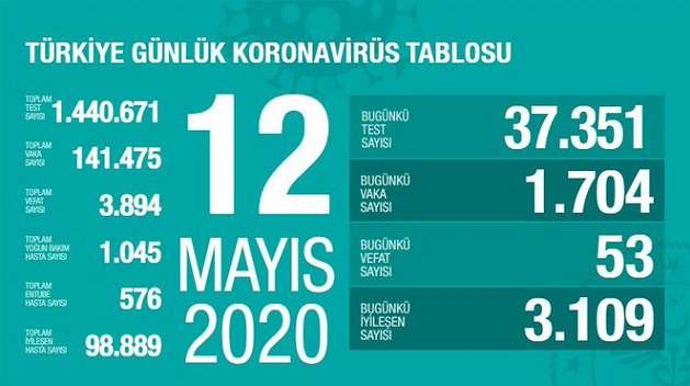 Sağlık Bakanı Dr. Fahrettin Koca 12 Mayıs 2020 Sağlık Bakanlığının Türkiye güncel verilerine paylaştı; Pandemi Koronavirüs Covid_19'dan bugün 53, toplamda 3.894 kişi hayatını kaybetti.