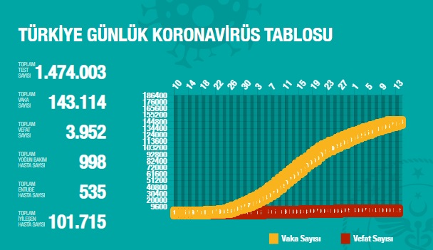 Sağlık Bakanı Dr. Fahrettin Koca sosyal medya hesabından yaptığı açıklmada; "YOĞUN BAKIMDAKİ HASTA SAYIMIZ İLK KEZ 1.000’in altına düştü. İyileşen hasta sayımız 100.000’i aştı. Toplam test sayımız yaklaşık 1,5 milyon. Virüse karşı asıl gücümüz: Maske + 1,5 Metre Sosyal Mesafe. Risk, en çok kalabalık ortamlarda. Uzak duralım" dedi.