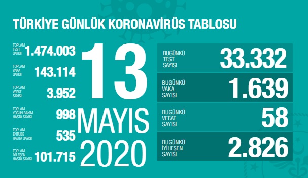 Sağlık Bakanlığı tarafından 13 Mayıs 2020 tarihli, Türkiye Günlük Koronavirüs Covid_19 Tablosu paylaşıldı.