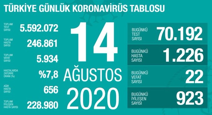 Sağlık Bakanlığı tarafından 14 Ağustos 2020 tarihli, Türkiye Günlük Koronavirüs Covid_19 Tablosu paylaşıldı.