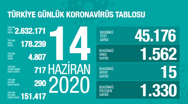 Sağlık Bakanlığı tarafından 14 Haziran 2020 tarihli, Türkiye Günlük Koronavirüs Covid_19 Tablosu paylaşıldı.