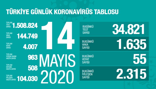 Sağlık Bakanlığı tarafından 14 Mayıs 2020 tarihli, Türkiye Günlük Koronavirüs Covid_19 Tablosu paylaşıldı.