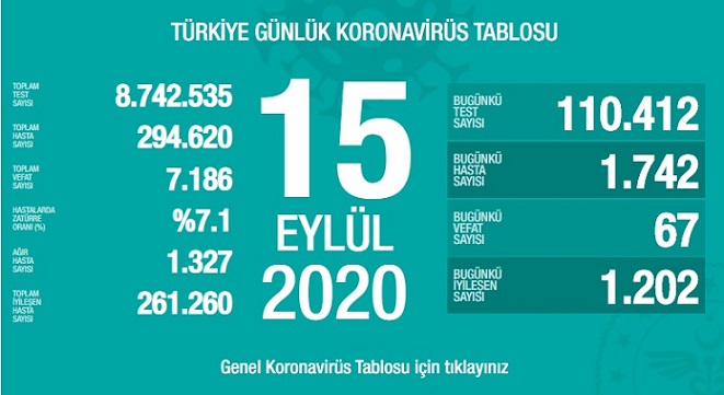 Sağlık Bakanlığı tarafından 15 Eylül 2020 tarihli, Türkiye Günlük Koronavirüs Covid_19 Tablosu paylaşıldı.