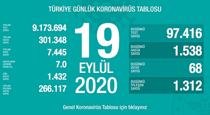 Sağlık Bakanlığı tarafından 19 Eylül 2020 tarihli, Türkiye Günlük Koronavirüs Covid_19 Tablosu paylaşıldı.