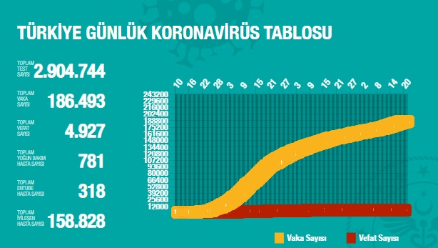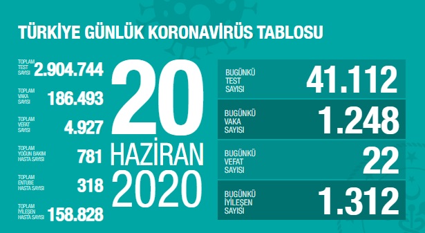 Sağlık Bakanlığı tarafından 20 Haziran 2020 tarihli, Türkiye Günlük Koronavirüs Covid_19 Tablosu paylaşıldı.
