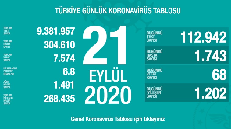 Sağlık Bakanlığı tarafından 21 Eylül 2020 tarihli, Türkiye Günlük Koronavirüs Covid_19 Tablosu paylaşıldı.