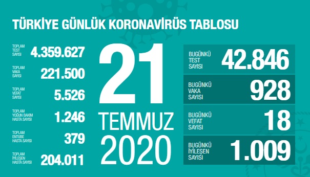 Sağlık Bakanlığı tarafından 21 Temmuz 2020 tarihli, Türkiye Günlük Koronavirüs Covid_19 Tablosu paylaşıldı.