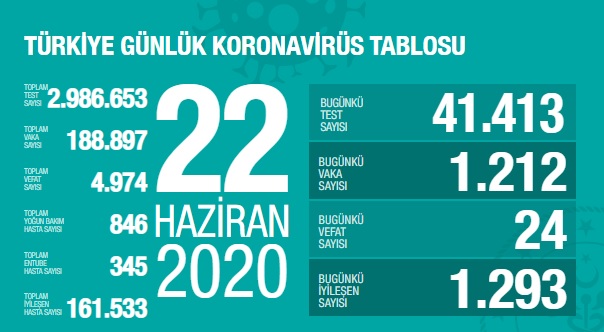 Sağlık Bakanlığı tarafından 22 Haziran 2020 tarihli, Türkiye Günlük Koronavirüs Covid_19 Tablosu paylaşıldı.