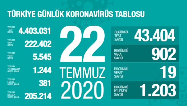 Sağlık Bakanlığı tarafından 22 Temmuz 2020 tarihli, Türkiye Günlük Koronavirüs Covid_19 Tablosu paylaşıldı.