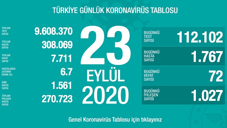 Sağlık Bakanlığı tarafından 23 Eylül 2020 tarihli, Türkiye Günlük Koronavirüs Covid_19 Tablosu paylaşıldı.