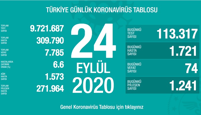 Sağlık Bakanlığı tarafından 24 Eylül 2020 tarihli, Türkiye Günlük Koronavirüs Covid_19 Tablosu paylaşıldı.