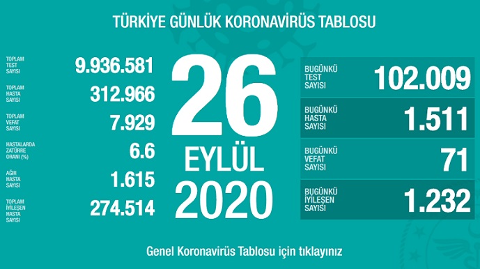 Sağlık Bakanlığı tarafından 26 Eylül 2020 tarihli, Türkiye Günlük Koronavirüs Covid_19 Tablosu paylaşıldı.