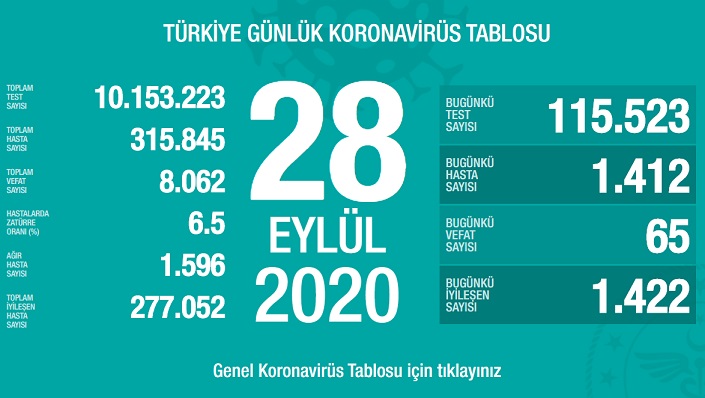 Sağlık Bakanlığı tarafından 28 Eylül 2020 tarihli, Türkiye Günlük Koronavirüs Covid_19 Tablosu paylaşıldı.
