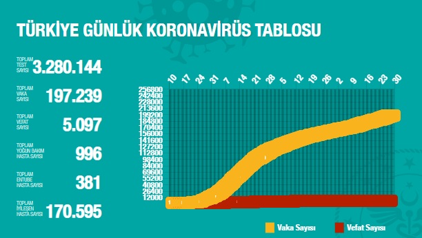 Sağlık Bakanı Dr. Fahrettin Koca sosyal medya hesabından yaptığı açıklmada; "Yeni tanı konan kişi sayısında düne kıyasla 16, bir önceki güne kıyasla 40 azalma var. Bugün iyileşen toplam vaka sayımız, dünkünden 571 kişi düşük. Vaka sayılarını azaltmada yeterince hızlı, mücadelede tam tedbirli değiliz. Yaz, rehavete neden olmamalı" dedi.