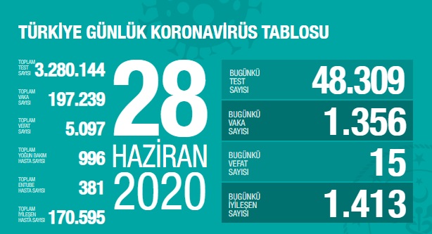 Sağlık Bakanlığı tarafından 28 Haziran 2020 tarihli, Türkiye Günlük Koronavirüs Covid_19 Tablosu paylaşıldı.