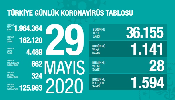 Sağlık Bakanlığı tarafından 29 Mayıs 2020 tarihli, Türkiye Günlük Koronavirüs Covid_19 Tablosu paylaşıldı.