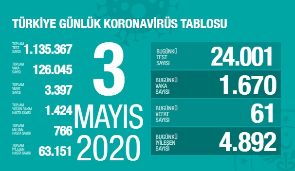 Sağlık Bakanlığı tarafından 3 Mayıs 2020 tarihli, Türkiye Günlük Koronavirüs Covid_19 Tablosu paylaşıldı.