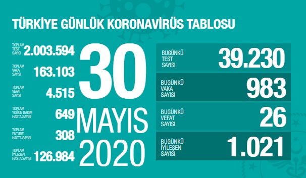 Sağlık Bakanı Dr. Fahrettin Koca 30 Mayıs 2020 Sağlık Bakanlığının Türkiye güncel verilerine paylaştı; Pandemi Koronavirüs Covid_19'dan bugün 26, toplamda 4.515 kişi hayatını kaybetti.