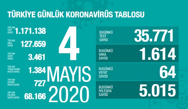 Sağlık Bakanı Dr. Fahrettin Koca 4 Mayıs 2020 Sağlık Bakanlığının Türkiye güncel verilerine paylaştı; Pandemi Koronavirüs Covid_19'dan bugün 64, toplamda 3.461 kişi hayatını kaybetti.