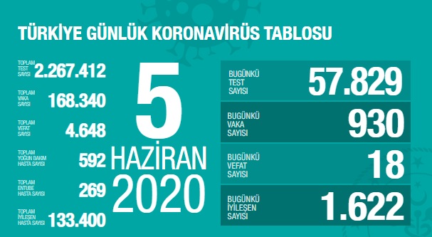 Sağlık Bakanlığı tarafından 5 Haziran 2020 tarihli, Türkiye Günlük Koronavirüs Covid_19 Tablosu paylaşıldı.