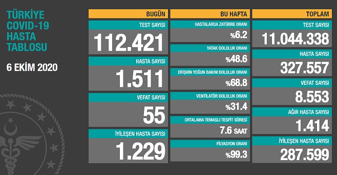 Sağlık Bakanlığı tarafından 6 Ekim 2020 tarihli, Türkiye Günlük Koronavirüs Covid_19 Tablosu paylaşıldı.