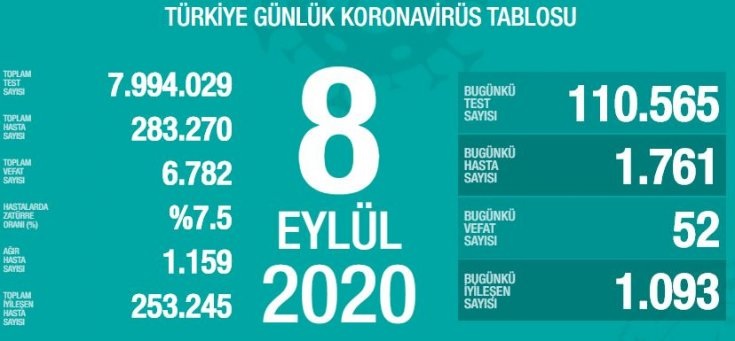 Sağlık Bakanlığı tarafından 8 Eylül 2020 tarihli, Türkiye Günlük Koronavirüs Covid_19 Tablosu paylaşıldı.