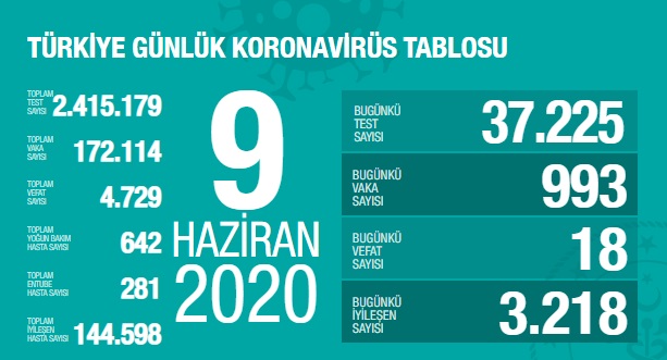 Sağlık Bakanlığı tarafından 9 Haziran 2020 tarihli, Türkiye Günlük Koronavirüs Covid_19 Tablosu paylaşıldı.