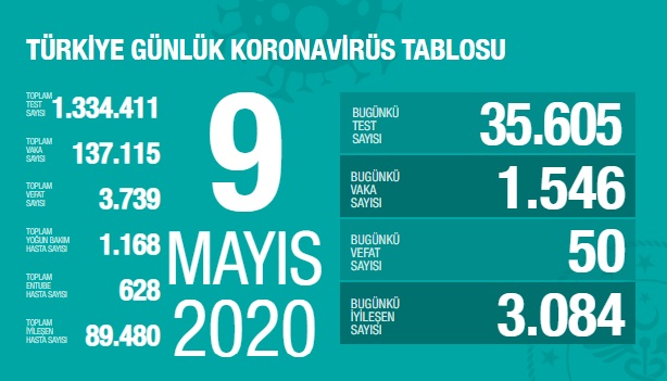 Sağlık Bakanı Dr. Fahrettin Koca 9 Mayıs 2020 Sağlık Bakanlığının Türkiye güncel verilerine paylaştı; Pandemi Koronavirüs Covid_19'dan bugün 50, toplamda 3.739 kişi hayatını kaybetti.