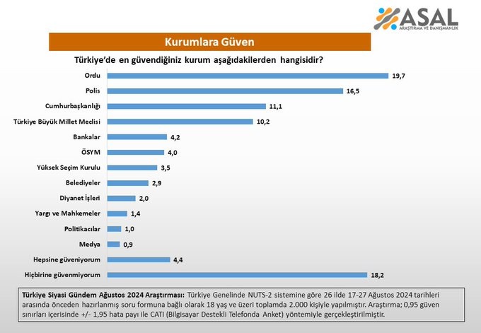 ASAL Aratırma ve Danışmanlık Şirketinin Ağustos'da 2000 kişi ile yaptığı son ankette, Türkiye'de en güvendiğiniz kurum? sorusuna Ordu:%19.7, Polis: %16.5, Cumhurbaşkanlığı:%11.1, TBMM:%10.2 yanıtını aldı.
