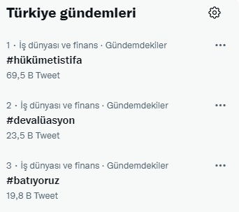 Hükümet istifa, dolar 12 lira, devalüasyon, batıyoruz, Hedef 20.23” etiketleri listede yer aldı.