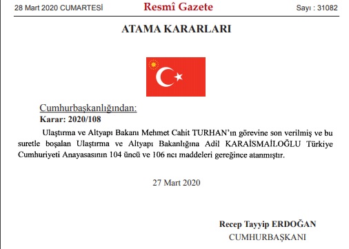 Karara göre, Anayasa'nın 104 ve 106'ncı maddeleri gereğince Cumhurbaşkanı Kararı ile Ulaştırma ve Altyapı Bakanı Cahit Turhan'ın görevine son verildi. Turhan'ın yerine Bakan Yardımcısı Adil Karaismailoğlu getirildi.