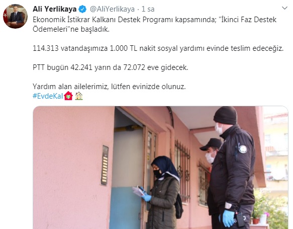 İstanbul Valisi Ali Yerlikaya sosyal medya hesabından yaptığı paylaşımla ikinci faz destek ödemelerinin başladığını açıkladı. Vali Yerlikaya'nın paylaşımında, "Ekonomik İstikrar Kalkanı Destek Programı kapsamında; "İkinci Faz Destek Ödemeleri"ne başladık. 114.313 vatandaşımıza 1.000 TL nakit sosyal yardımı evinde teslim edeceğiz. PTT bugün 42.241 yarın da 72.072 eve gidecek. Yardım alan ailelerimiz, lütfen evinizde olunuz." ifadeleri yer aldı.