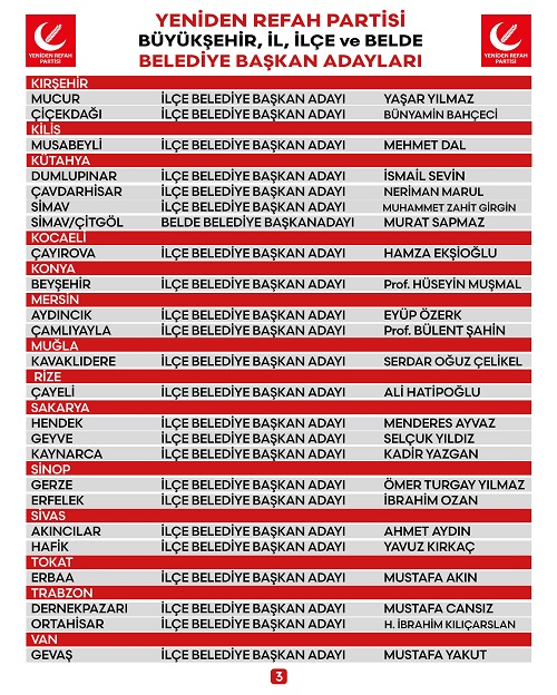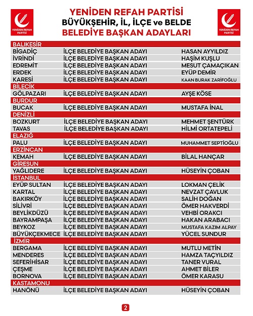 Açıklamaların ardından Genel Başkan Erbakan, “Mersin Büyükşehir Belediye Başkan Adayımız İzzeddin Alkan, Van Büyükşehir Belediye Başkan Adayı Abdullah Sadıksoy, Bartın Belediye Başkan Adayı Faruk Tutkun, Uşak Belediye Başkan Adayı Erol Korkmaz” olarak iki büyükşehir belediyesi ve iki il belediye başkan adayını açıkladı. İl Başkanları toplantısı basına kapalı olarak devam etti.